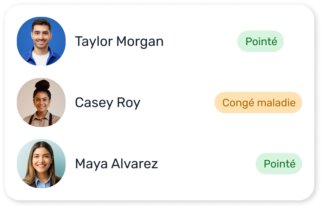 Visualisez en un coup d’œil qui est sur place, en retard ou absent. Une visibilité instantanée signifie moins de surprises à la fin de la période de paie.