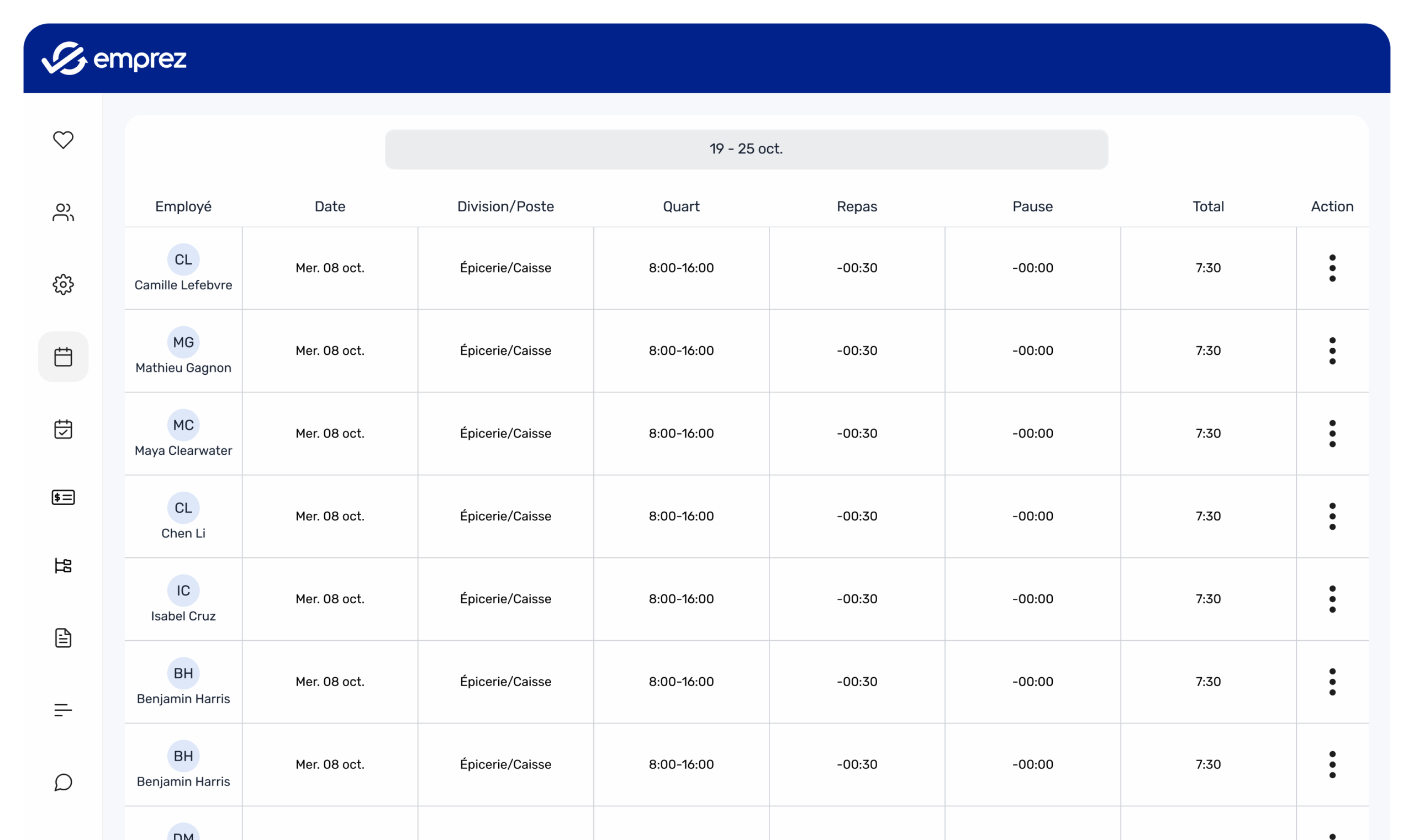 Emprez élimine les incertitudes liées à la gestion du temps. De l’exportation à la paie, chaque heure travaillée est suivie, approuvée et synchronisée automatiquement avec votre paie.
